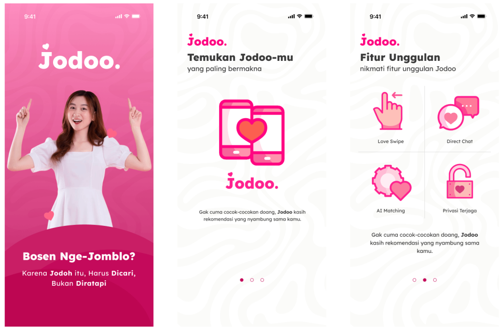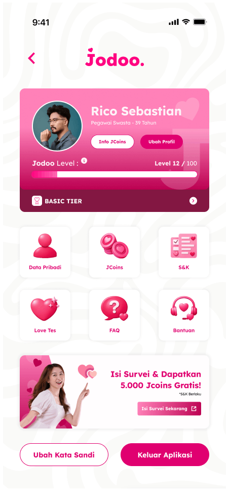 Logo dan fitur unggulan Jodoo. Selain fitur unggulan tersebut Jodoo memiliki produk lain seperti Jodoo coin (Jcoins), Love test, Basic level dan Premium.